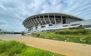 広島市中央公園時代からある木々。木陰ができてちょっと休憩におすすめのひろしまスタジアムパーク。そこから見えるエディオンピースウイング広島。