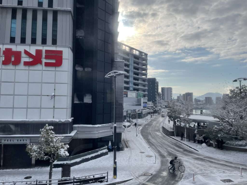 雪景色の広島駅前の市電からの眺め